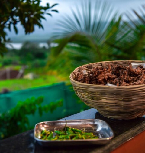 Chicken Thali – Chicken sukka, Chicken rassa, 2 Chapati/Bhakari, Dal, Rice, Papad, Thecha