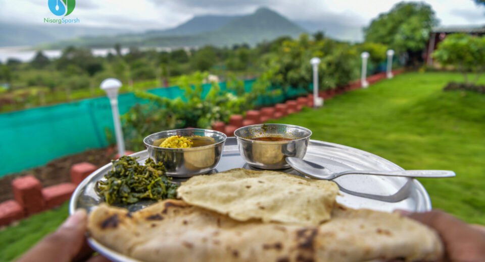 Veg Thali – 1 dry vegetable, 1 gravy vegetable, 2 Chapati/Bhakari, Dal, Rice, Papad, Thecha